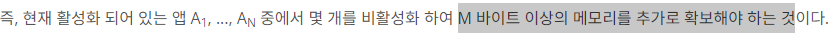 - 그러므로 현재 앱을 선택하기 전 만들어 낼 수 있는 메모리(table[j - c[i]]를 보고 비활성했을 때 메모리를 합산한 것이 더 큰지 아닌지 결정
