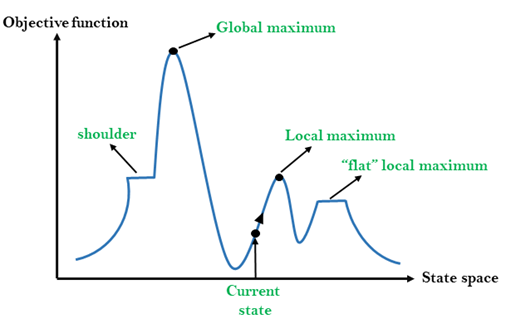 위 그림처럼 Current state와 같은 상황이 주어졌다면, 최댓값을 찾는 것이 목표이므로 더 높은 값을 찾아가게 됩니다. 이때 알고리즘은 Local maxima에 빠지게 됩니다.